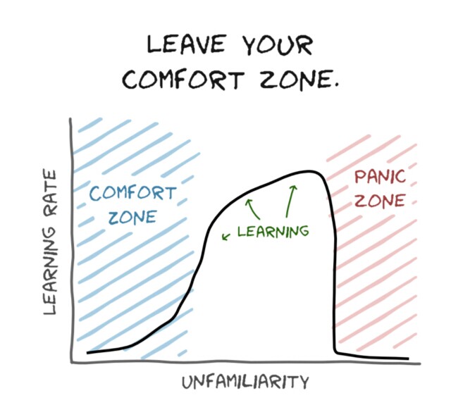 而正如上图所示,在到达恐慌的境地之前的最高点,我们能学得更多,成长得更快,变得更优秀。找到你的学习最高点。