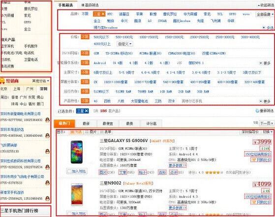 我们继续搜索“三星手机”这个词,进入太平洋网站,其网站标题为:三星手机最新报价_最新三星手机【最新报价大全】。关键词满足报价需求。从太平洋的内容我们会发现,可以选择三星手机价格、网络、系统、尺寸、分辨率等。同时底部可以发现三星手机的型号参数、价格及图片,可以说搜索“三星手机”下拉框的所有需求都被满足。同时我们可以看到有其他产品的选择、经销商的联系方式、手机相关产品选择、手机资讯、三星手机排行榜及对比的功能,这些并不属于需求,但与关键词“三星手机”有密切相关,我们可以