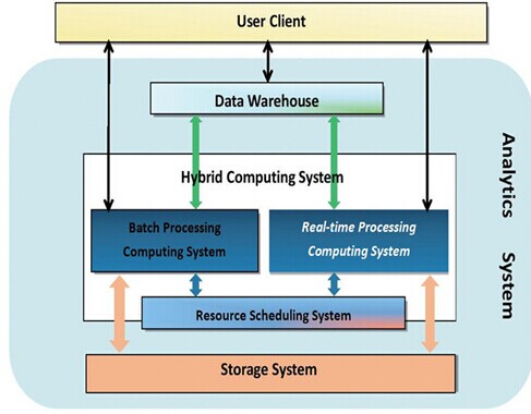 图1从整个分析系统的架构角度,给出了实时计算子系统所处的位置。实时计算系统和批处理计算系统同属于计算这个大的范畴,批处理计算可以是 MapReduce、MPI、SCOPE等,实时计算可以是S4、Storm等,批处理和实时都可以或不依赖统一的资源调度系统。另外,计算系统的输入、输出,包括中间过程的输入、输出,都与存储系统交互,可以是块存储系统HDFS,也可以是K-V存储系统Hypertable等。计算层的上层是数据仓库,或者直接和用户交互,交互方式可以是SQL-like或者MR-like等。