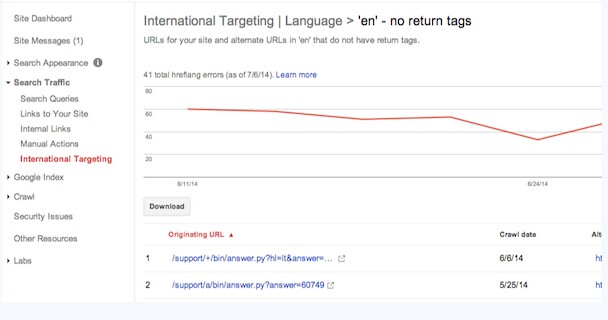 国 际定位功能可以实时监测网站中存在的有关rel=”alternative”及hreflang=”x”使用的任何问题。如页面A和页面B是语言不同但内 容相同的同等页面,为不同语言访问者而设计。页面A上使用了指向页面B的rel=”alternative”及 hreflang=”x”注释,而页面B却没有使用对页面A的注释标签,那么谷歌就会给予提醒(no return page)。