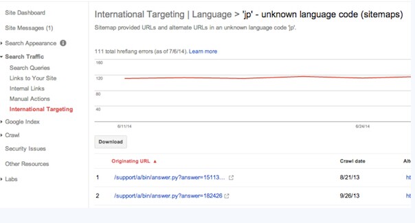 谷歌站长工具中国际定位还能提供的另一种提醒就是语言代码使用错误,比如把日语的缩写误写为jp,正确的代码是ja。谷歌是无法理解该目标语言的,就会给予提醒。