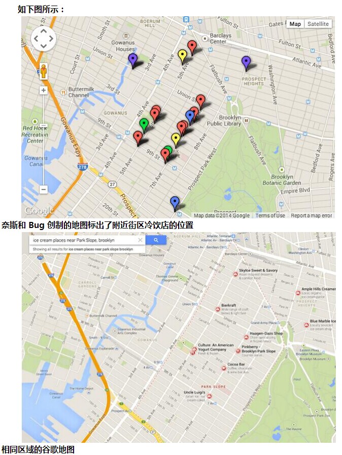 奈斯写道:“只用了短短几分钟时间,我们就做好了这幅地图,标出了 17 个有冰激凌出售的地点。这幅地图所提供的很多信息都是谷歌地图中没有的,例如冰激凌售卖车停放的地点,或是有软雪糕贩售的康涅狄格松饼店等。”
