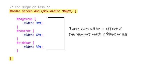 下面的规则集在当viewport宽度小于等于980px的时候生效。基本上,我把所有容器的宽度从像素值改成了百分比值,这样容器就会变得具有流动性(fluid)。
