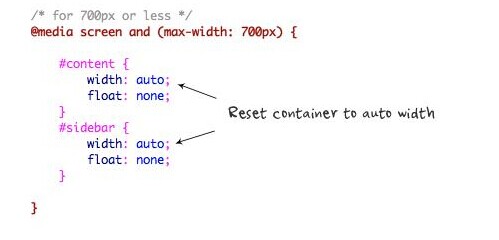 然后对于宽度小于或等于700px的viewport,指定#content和#sidebar为自动宽度,并且移除浮动,所以他们可以以全宽度进行展示。