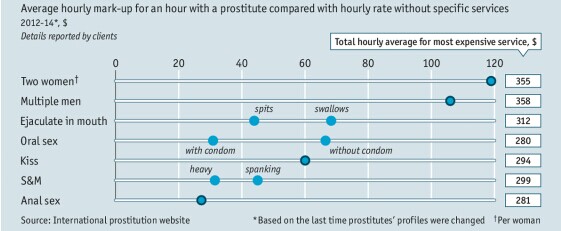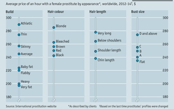 漂白后的头发算不上真正的金发,因而溢价水平较低,但仍比其他颜色的头发更有“销路”。如果本身的身材不够火爆,那么从经济角度来看,隆胸手术是值得的:从平胸变成D杯罩后,每小时的嫖资大约增长40美元。按照3700美元的常规隆胸手术价格计算,大约只要90小时便可收回成本。