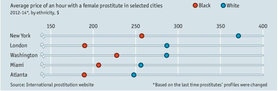 由于数据太少,因此无法按照种族因素对其他城市进行分类统计。但美利坚大学的克里斯蒂安·钦(Christine Chin)曾经对一些国家的高端跨国妓女进行过研究。她发现,在吉隆坡,黑人妓女的要价很高。而在新加坡,价格较高的则是越南妓女。在迪拜,欧洲妓女价格最高。不同地区对于“异国风情”和“令人满意”的定义各有不同,这要取决于人口流动等很多因素。
