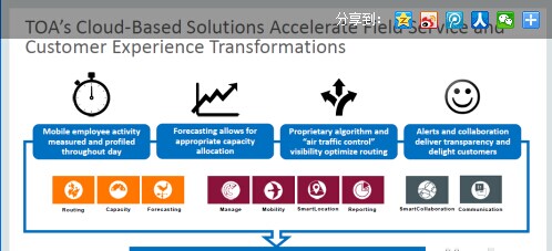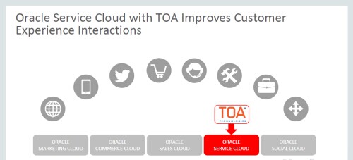 TOA Technologies是一家基于云的现场服务解决方案供应商,主要负责区域服务人员的调度。甲骨文指出,TOA的现场服务软件即服务SaaS解决方案能够帮助企业用户持续监控来自呼叫中心的实时现场服务请求,安排合适的现场服务代表并加以派遣,利用业务分析机制监控并查看当前库存、准确地预测服务窗口工作强度并优化现场服务执行。