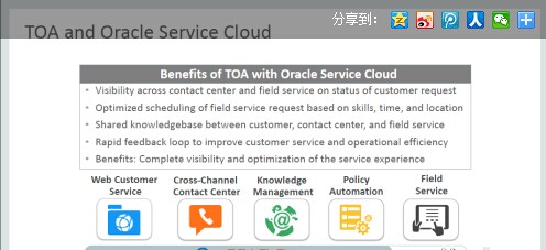 现场服务是客户服务体系中的重要一环,通过将TOA技术成果与甲骨文Service Cloud相结合,帮助企业用户顺利应对从呼叫中心到服务调度再到实际交付的面对面协作服务。此外,TOA也将与甲骨文的ERP Cloud与ERP应用相结合。