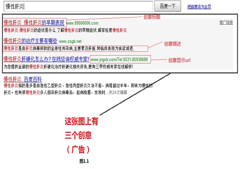 如果我们不做百度推广,那么这个患者,就找不到我们医院的网站。后面的事情,也就不用提了。 如果我们做了百度推广,百度推广可以通过一个出价,来让我们医院把我们的广告放出来(我们 的广告,百度称之为“创意”)。 这个患者看到了我们的创意(广告),并且引起了他的注意或者兴趣,那么患者点击这个创意, 就进入了我们医院的网站(www.wftjyy.com),与此同时,我们向百度缴纳了这个关键词(“慢性肝炎”)的点击费用。